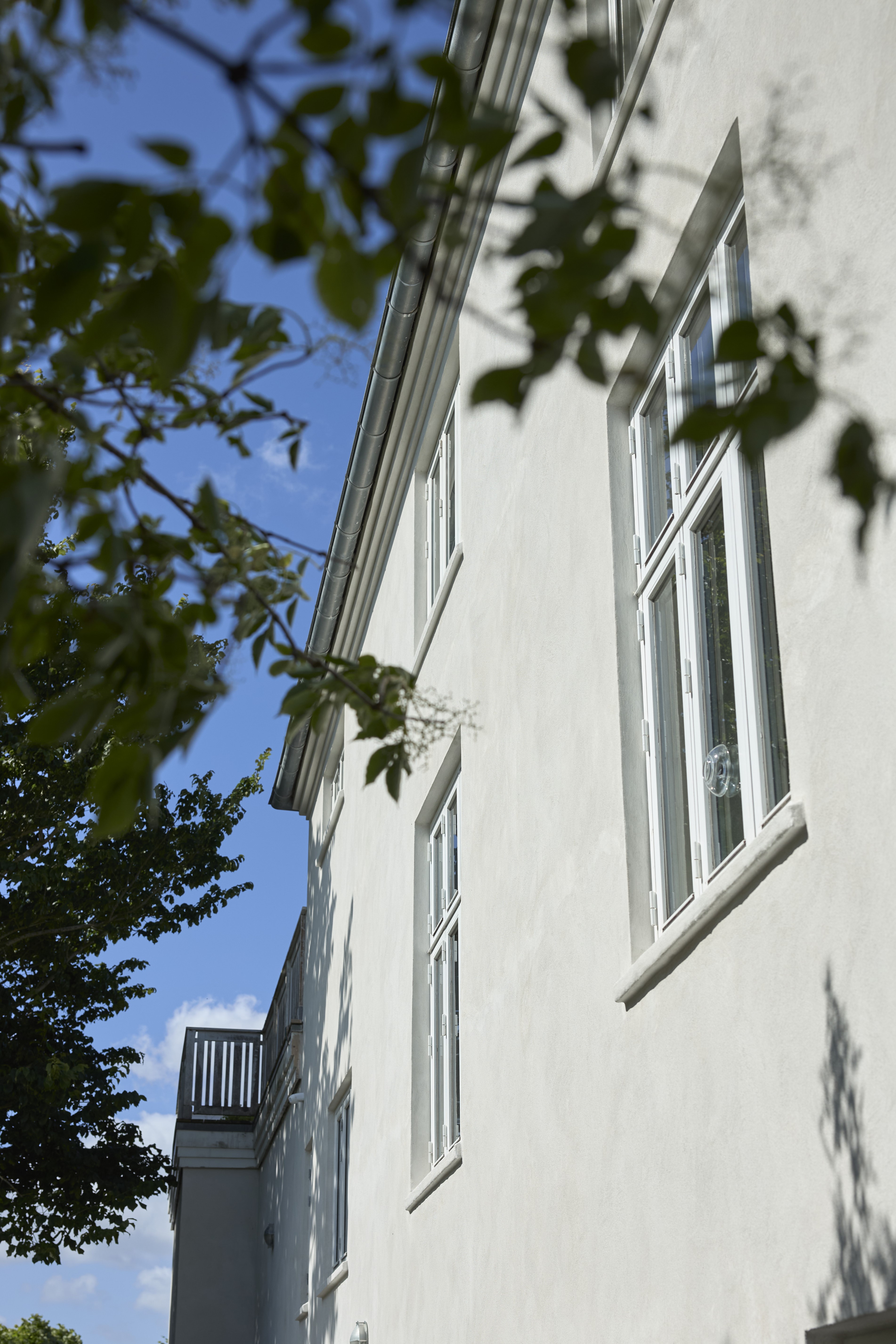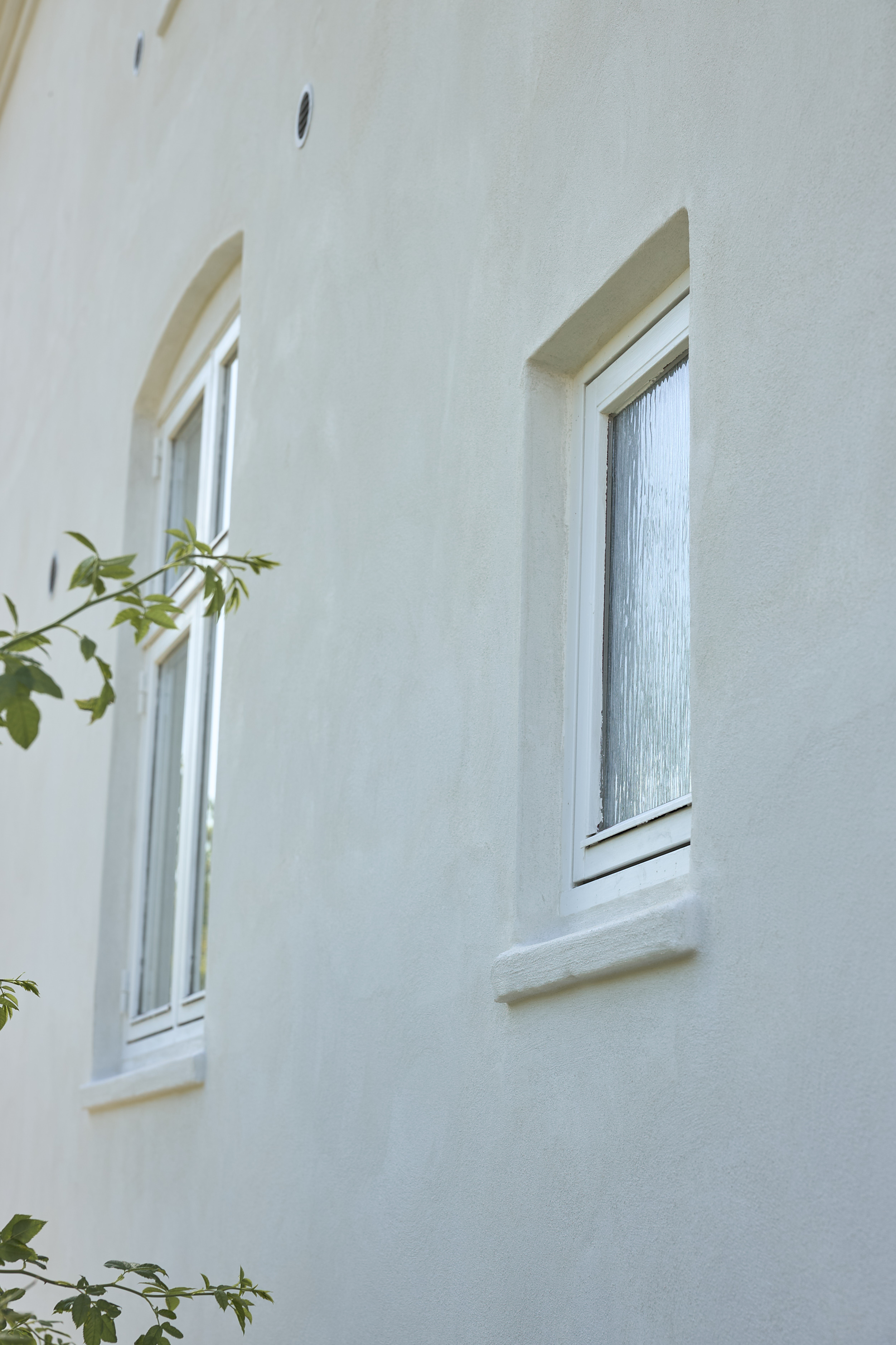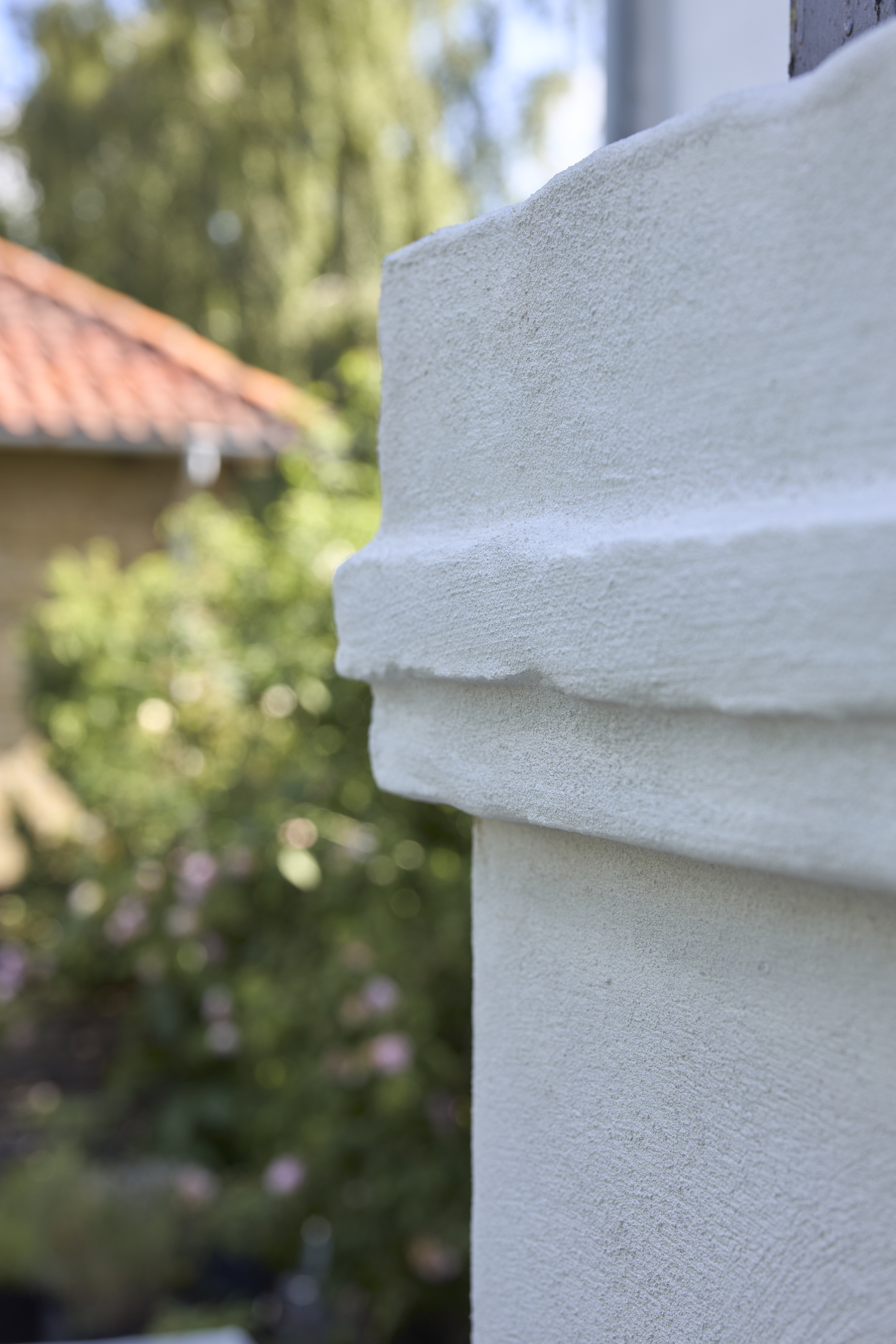 Denne flotte villa har netop fået et kærligt ansigtsløft. Facaden blev først og fremmest sandblæst for gammel maling og løst puds, og på den måde fik vi et rent og stabilt underlag at arbejde videre på. Efterfølgende blev facaden pudset op med anvendelse af Nordisk NHL-produkter. NHL-kalkmørtel er baseret på ren og naturlig hydraulisk kalk, som er det sundeste og mest naturlige materiale at restaurere eller vedligeholde sit gamle hus med. Brugen af kalk som pudse materiale kan dateres flere hundrede år tilbage, og er den dag i dag stadig et fortrukket materiale i forbindelse med pudsning af facade. Kalk-mørtel er meget åndbart, hvilket hjælper facaden med at få luft, og derudover bliver facaden også mere resistente overfor salte og fugt. Dette har en skånsom effekt mod den oprindelige murkonstruktion. Resultatet er en facade, der både ser flot ud og kan holde i mange år fremover.